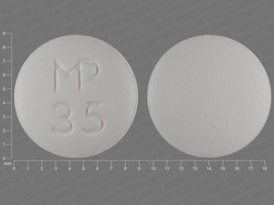 This medication is a White Round 9 mm, Tablet with imprint "MP;35". It contains 25 mg of Spironolactone 25 mg. It is manufactured by Mutual Pharmaceutical Company, Inc.. For details please contact your physician.