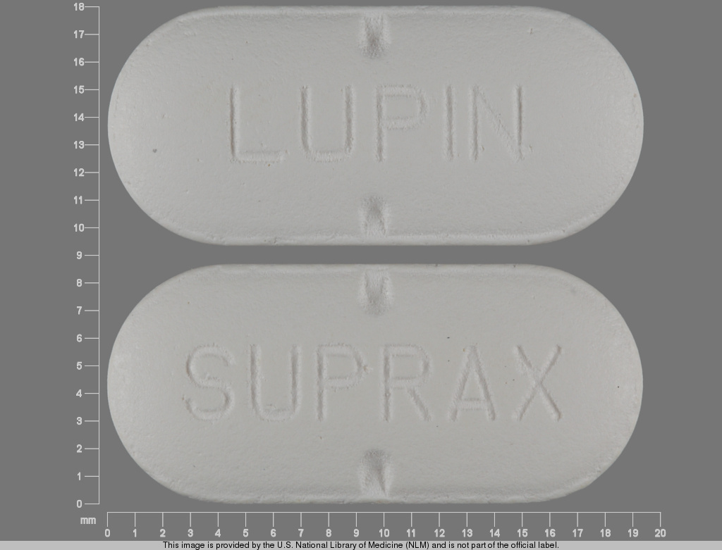 This medication is a White Capsule 19 mm, Tablet with imprint "SUPRAX;LUPIN". It contains Cefixime 400 mg; of Cefixime[cefixime anhydrous];. It is manufactured by Lupin Pharmaceuticals, Inc.. For details please contact your physician.