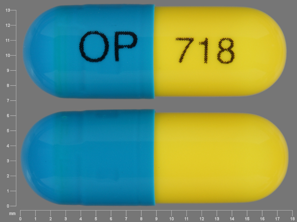 This medication is a Blue;yellow Capsule 18 mm, Capsule with imprint "OP;718". It contains Trimipramine maleate 25 mg; of Trimipramine maleate[trimipramine];. It is manufactured by Teva Women's Health, Inc.. For details please contact your physician.