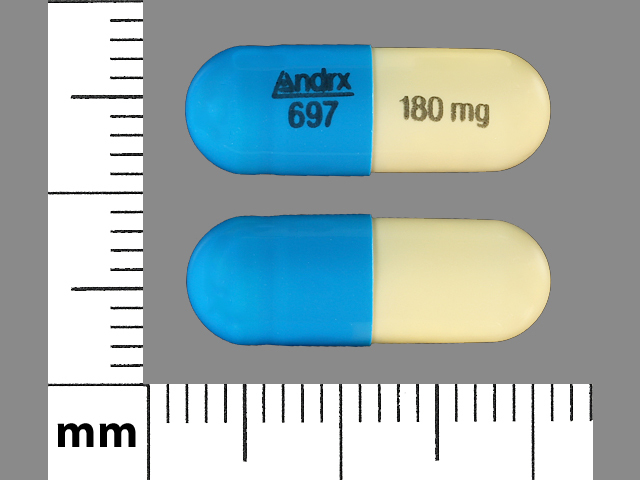 This medication is a Brown;blue Capsule 19 mm, Extended release capsule with imprint "Andrx;697;180;mg". It contains Diltiazem hydrochloride 180 mg; of Diltiazem hydrochloride[diltiazem];. This belongs to the Calcium channel blocker pharmacologic class. It is manufactured by Actavis Pharma, Inc.. For details please contact your physician.