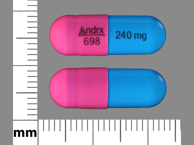 This medication is a Blue;pink Capsule 22 mm, Extended release capsule with imprint "Andrx;698;240;mg". It contains Diltiazem hydrochloride 240 mg; of Diltiazem hydrochloride[diltiazem];. This belongs to the Calcium channel blocker pharmacologic class. It is manufactured by Actavis Pharma, Inc.. For details please contact your physician.