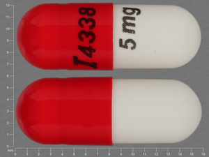This medication is a White, red Capsule 16 mm, Capsule with imprint "I;4338;5;mg". It contains 5 mg of Terazosin hydrochloride 5 mg. It is manufactured by Teva Pharmaceuticals USA Inc. For details please contact your physician.