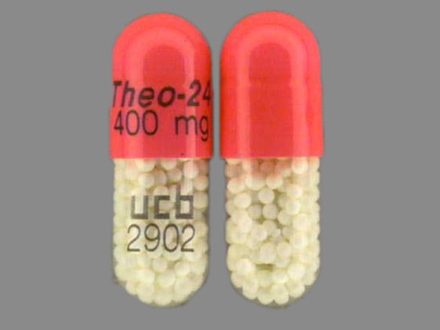 This medication is a Pink Capsule 22 mm, Extended release capsule with imprint "Theo;24;400;mg;ucb;2902". It contains Theophylline anhydrous 400 mg; of Theophylline anhydrous[theophylline anhydrous];. It is manufactured by UCB, Inc.. For details please contact your physician.