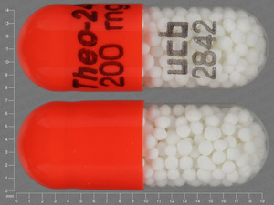 This medication is a Red, white Capsule 19 mm, Extended release capsule with imprint "Theo;24;200;mg;ucb;2842". It contains 200 mg of Theophylline anhydrous 200 mg. It is manufactured by UCB, Inc.. For details please contact your physician.