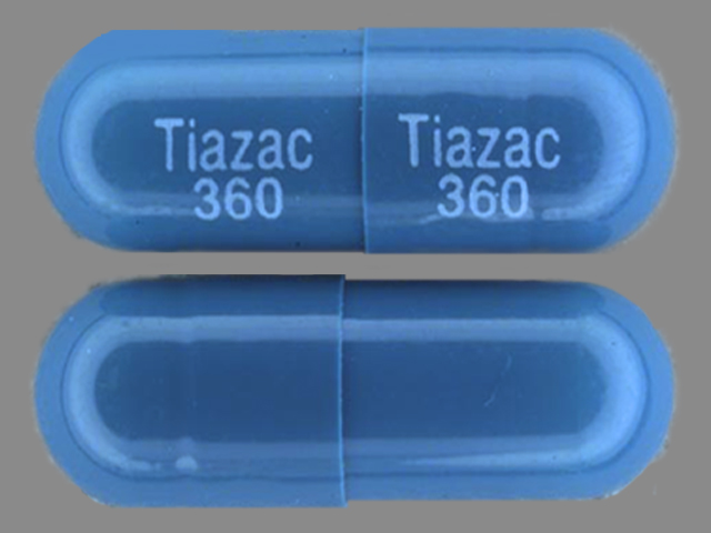 This medication is a Blue Capsule 22 mm, Extended release capsule with imprint "Tiazac;360". It contains Diltiazem hydrochloride 360 mg of Diltiazem hydrochloride[diltiazem]. This belongs to the Calcium channel blocker pharmacologic class. It is manufactured by Forest Laboratories, Inc.. For details please contact your physician.