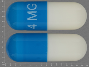 This medication is a White, blue Capsule 16 mm, Capsule with imprint "4;MG". It contains 4 mg of Tizanidine hydrochloride 4 mg. It is manufactured by Acorda Therapeutics, Inc.. For details please contact your physician.