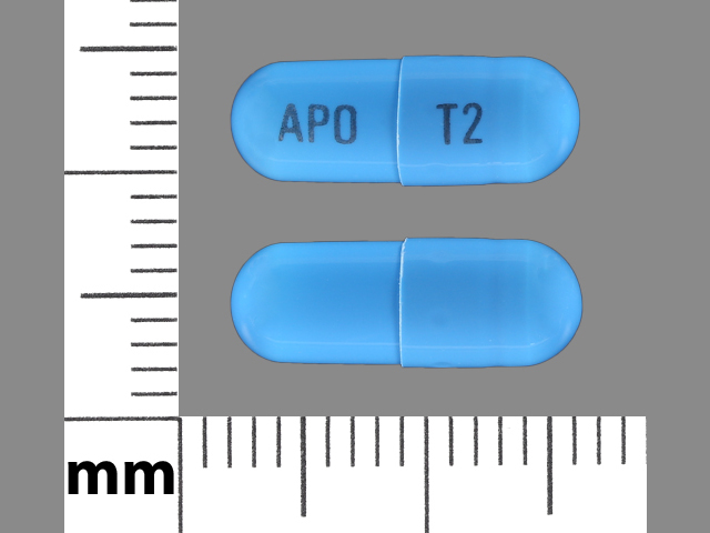 This medication is a Blue;blue Capsule 14 mm, Gelatin coated capsule with imprint "APO;T2". It contains Tizanidine hydrochloride 2 mg; of Tizanidine hydrochloride[tizanidine];. This belongs to the Central alpha-2 adrenergic agonist pharmacologic class. It is manufactured by AvKARE, Inc.. For details please contact your physician.