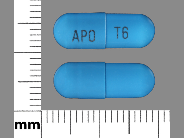 This medication is a Blue;blue Capsule 18 mm, Gelatin coated capsule with imprint "APO;T6". It contains Tizanidine hydrochloride 6 mg; of Tizanidine hydrochloride[tizanidine];. This belongs to the Central alpha-2 adrenergic agonist pharmacologic class. It is manufactured by AvKARE, Inc.. For details please contact your physician.