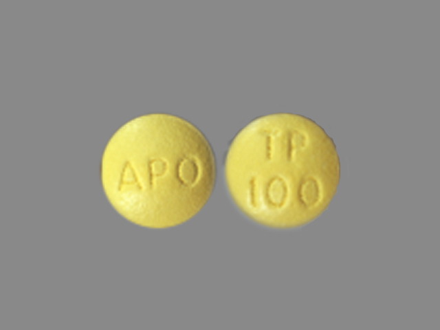This medication is a Yellow Round 7 mm, Film coated tablet with imprint "APO;TP;100". It contains Topiramate 100 mg; of Topiramate[topiramate];. This belongs to the Cytochrome p450 2c19 inhibitors, cytochrome p450 3a4 inducers, decreased central nervous system disorganized electrical activity pharmacologic class. It is manufactured by Apotex Corp. For details please contact your physician.