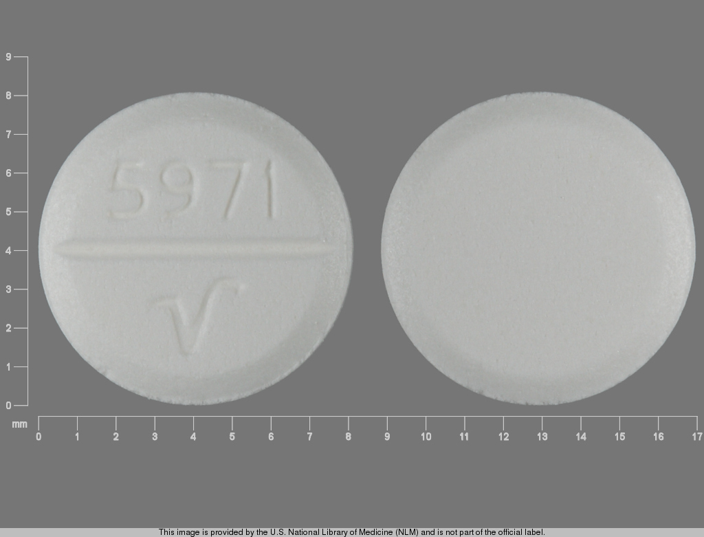 This medication is a White Round 8 mm, Tablet with imprint "5971;V". It contains Trihexyphenidyl hydrochloride 2 mg; of Trihexyphenidyl hydrochloride[trihexyphenidyl];. It is manufactured by Qualitest Pharmaceuticals. For details please contact your physician.