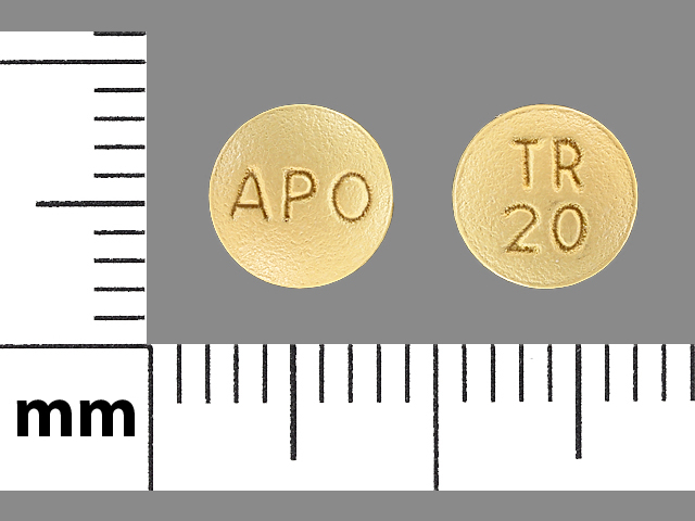 This medication is a Yellow Round 6 mm, Tablet with imprint "APO;TR;20". It contains Trospium chloride 20 mg; of Trospium chloride[trospium];. This belongs to the Cholinergic muscarinic antagonist pharmacologic class. It is manufactured by Golden State Medical Supply, Inc.. For details please contact your physician.