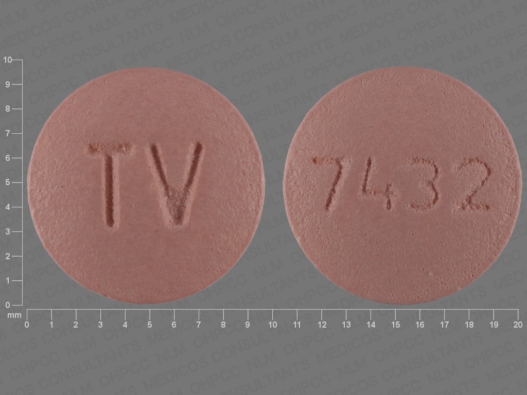 This medication is a Pink Round 10 mm, Tablet with imprint "7432;TV". It is manufactured by Teva Pharmaceuticals USA Inc. For details please contact your physician.