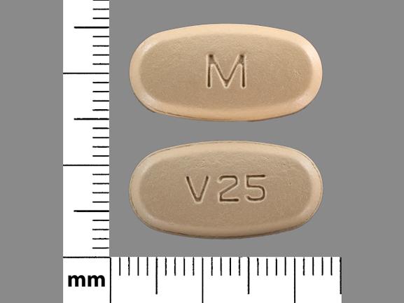 This medication is an Orange Oval 21 mm, Film coated tablet with imprint "M;V25". It contains Valsartan 320 mg;hydrochlorothiazide 25 mg; of Valsartan[valsartan];hydrochlorothiazide[hydrochlorothiazide];. It is manufactured by Mylan Pharmaceuticals Inc.. For details please contact your physician.