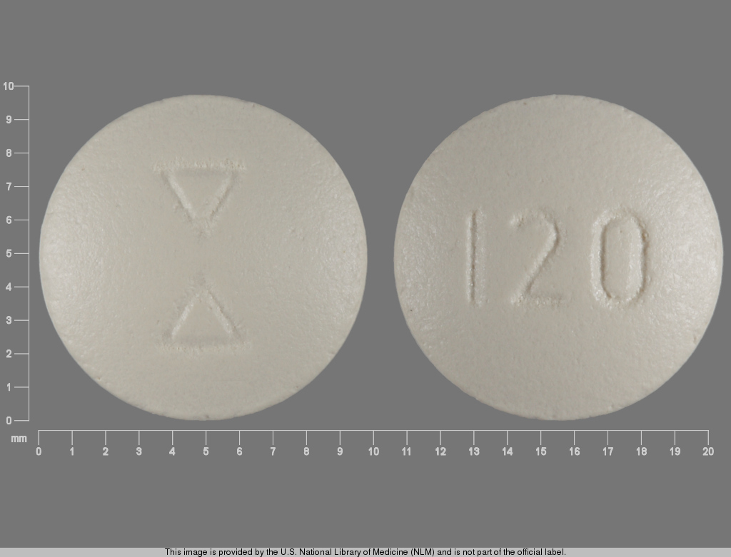 This medication is a White Round 10 mm, Film coated extended release tablet with imprint "120". It contains Verapamil hydrochloride 120 mg; of Verapamil hydrochloride[verapamil];. This belongs to the Calcium channel blocker pharmacologic class. It is manufactured by IVAX Pharmaceuticals, Inc.. For details please contact your physician.