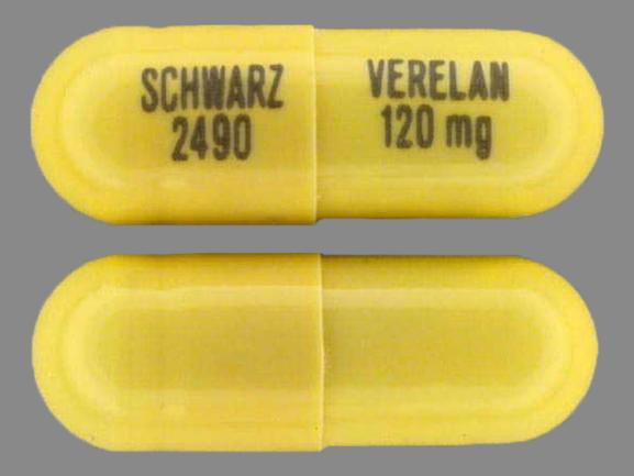 This medication is a Yellow Capsule 18 mm, Delayed release pellet in capsule with imprint "SCHWARZ;2490;VERELAN;120;mg". It contains Verapamil hydrochloride 120 mg; of Verapamil hydrochloride[verapamil];. This belongs to the Calcium channel blocker pharmacologic class. It is manufactured by UCB, Inc.. For details please contact your physician.