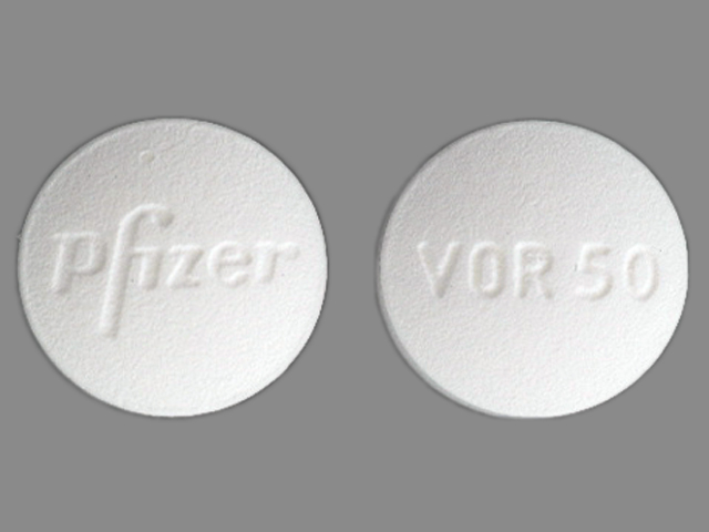 This medication is a White Round 7 mm, Film coated tablet with imprint "Pfizer;VOR50". It contains Voriconazole 50 mg; of Voriconazole[voriconazole];. This belongs to the Azole antifungal pharmacologic class. It is manufactured by Roerig. For details please contact your physician.