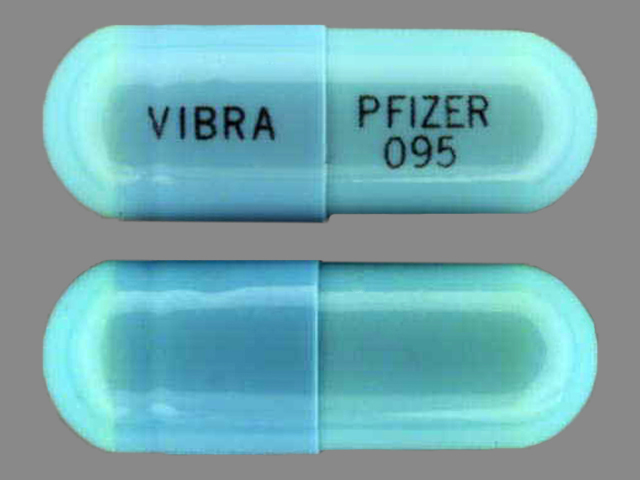 This medication is a Blue Capsule 22 mm, Capsule with imprint "Vibra;Pfizer;095". It contains Doxycycline hyclate 100 mg; of Doxycycline hyclate[doxycycline anhydrous];. It is manufactured by Pfizer Laboratories Div Pfizer Inc. For details please contact your physician.
