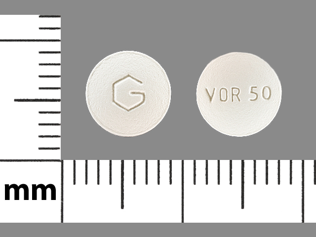 This medication is a White Round 7 mm, Film coated tablet with imprint "G;VOR50". It contains Voriconazole 50 mg; of Voriconazole[voriconazole];. This belongs to the Azole antifungal pharmacologic class. It is manufactured by Greenstone LLC. For details please contact your physician.