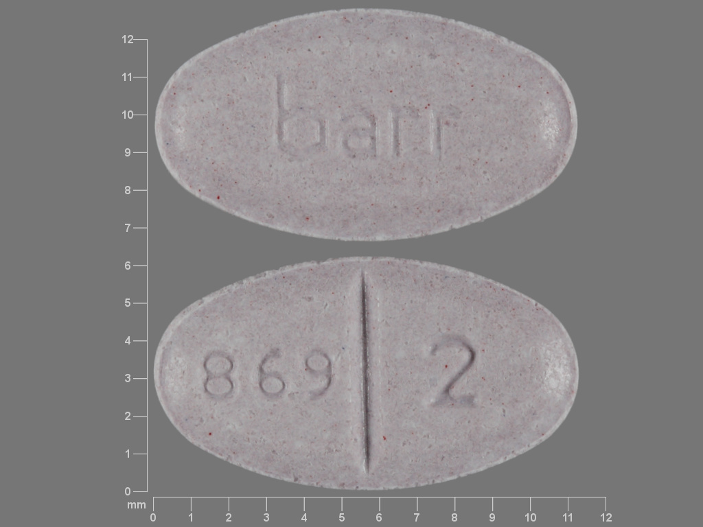 This medication is a Purple Oval 11 mm, Tablet with imprint "869;2;barr". It contains Warfarin sodium 2 mg; of Warfarin sodium[warfarin];. This belongs to the Vitamin k antagonist pharmacologic class. It is manufactured by A-S Medication Solutions. For details please contact your physician.