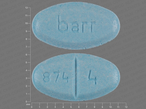This medication is a Blue Oval 11 mm, Tablet with imprint "874;4;barr". It contains 4 mg of Warfarin sodium 4 mg. It is manufactured by Barr Laboratories Inc.. For details please contact your physician.