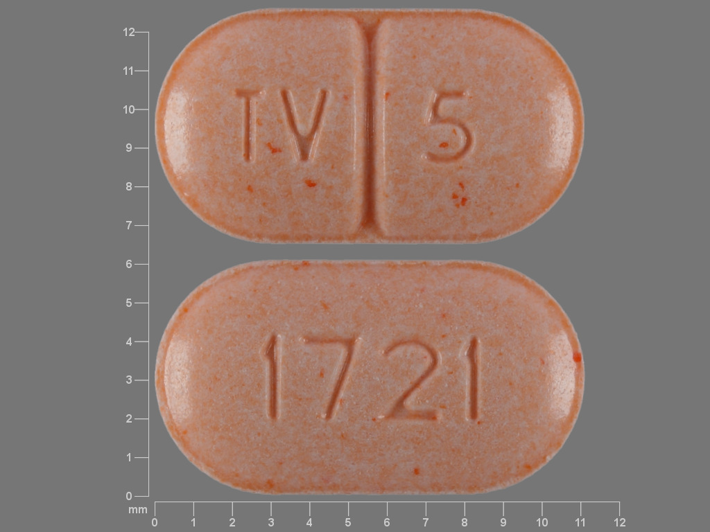 This medication is an Orange Oval 11 mm, Tablet with imprint "TV;5;1721". It contains Warfarin sodium 5 mg; of Warfarin sodium[warfarin];. This belongs to the Vitamin k antagonist pharmacologic class. It is manufactured by Teva Pharmaceuticals USA, Inc.. For details please contact your physician.
