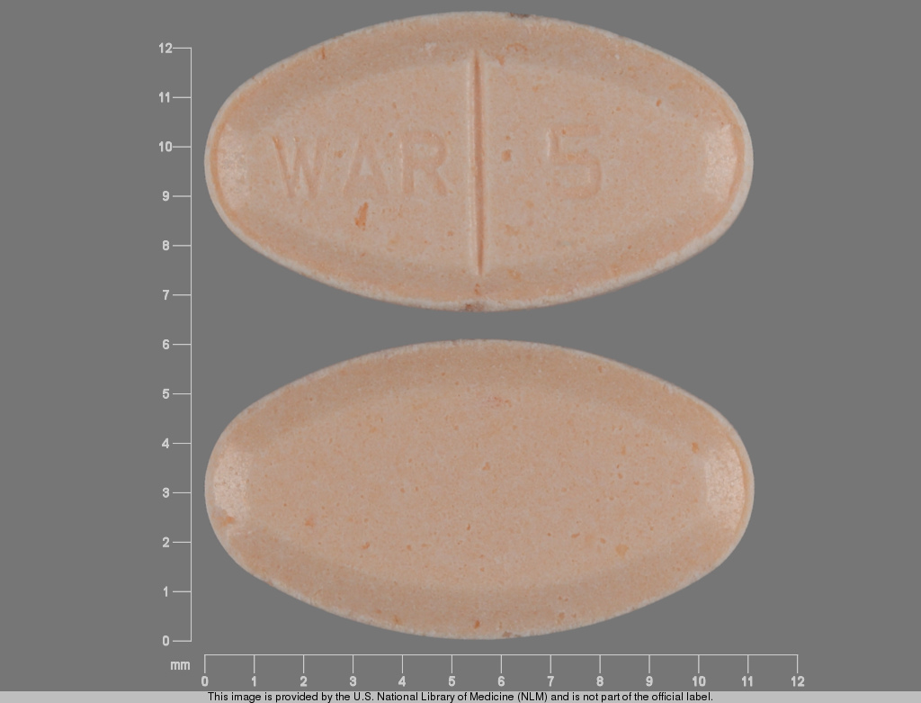 This medication is an Orange Oval 11 mm, Tablet with imprint "WAR;5". It contains Warfarin sodium 5 mg; of Warfarin sodium[warfarin];. This belongs to the Vitamin k antagonist pharmacologic class. It is manufactured by Zydus Pharmaceuticals (USA) Inc.. For details please contact your physician.