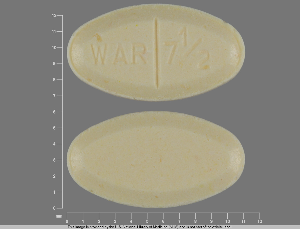 This medication is a Yellow Oval 11 mm, Tablet with imprint "WAR;7;1;2". It contains Warfarin sodium 7.5 mg; of Warfarin sodium[warfarin];. This belongs to the Vitamin k antagonist pharmacologic class. It is manufactured by Zydus Pharmaceuticals (USA) Inc.. For details please contact your physician.