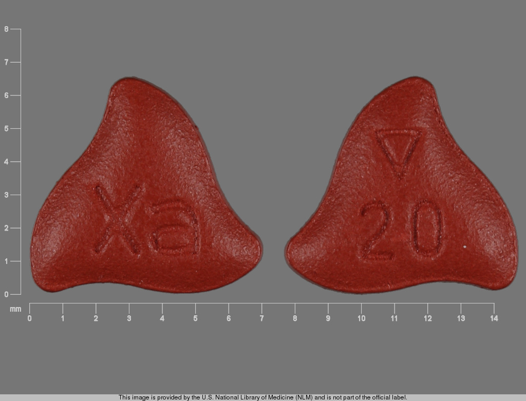 This medication is a Red Triangle 7 mm, Film coated tablet with imprint "20;Xa". It contains Rivaroxaban 20 mg; of Rivaroxaban[rivaroxaban];. This belongs to the Factor xa inhibitor pharmacologic class. It is manufactured by Janssen Pharmaceuticals, Inc.. For details please contact your physician.