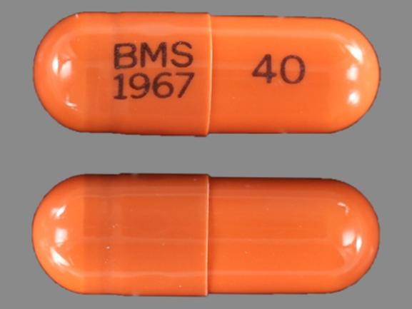 This medication is an Orange Capsule 1 mm, Gelatin coated capsule with imprint "BMS;1967;40". It contains Stavudine 40 mg; of Stavudine[stavudine];. It is manufactured by E.R. Squibb & Sons, L.L.C.. For details please contact your physician.