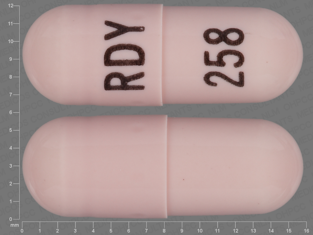 This medication is a Pink Capsule 16 mm, Capsule with imprint "RDY;258". It is manufactured by Dr.Reddys Laboratories Limited. For details please contact your physician.