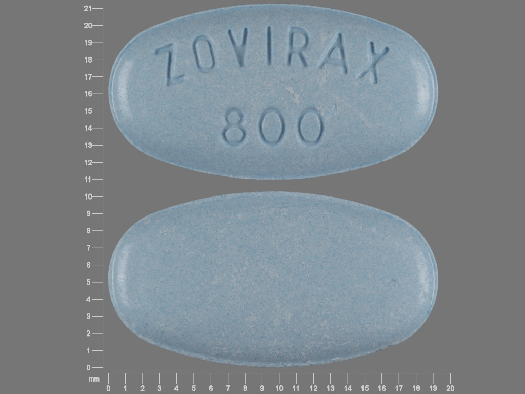 This medication is a Blue Oval 19 mm, Tablet with imprint "ZOVIRAX;800". It contains Acyclovir 800 mg; of Acyclovir[acyclovir];. This belongs to the Herpesvirus nucleoside analog dna polymerase inhibitor pharmacologic class. It is manufactured by GlaxoSmithKline LLC. For details please contact your physician.